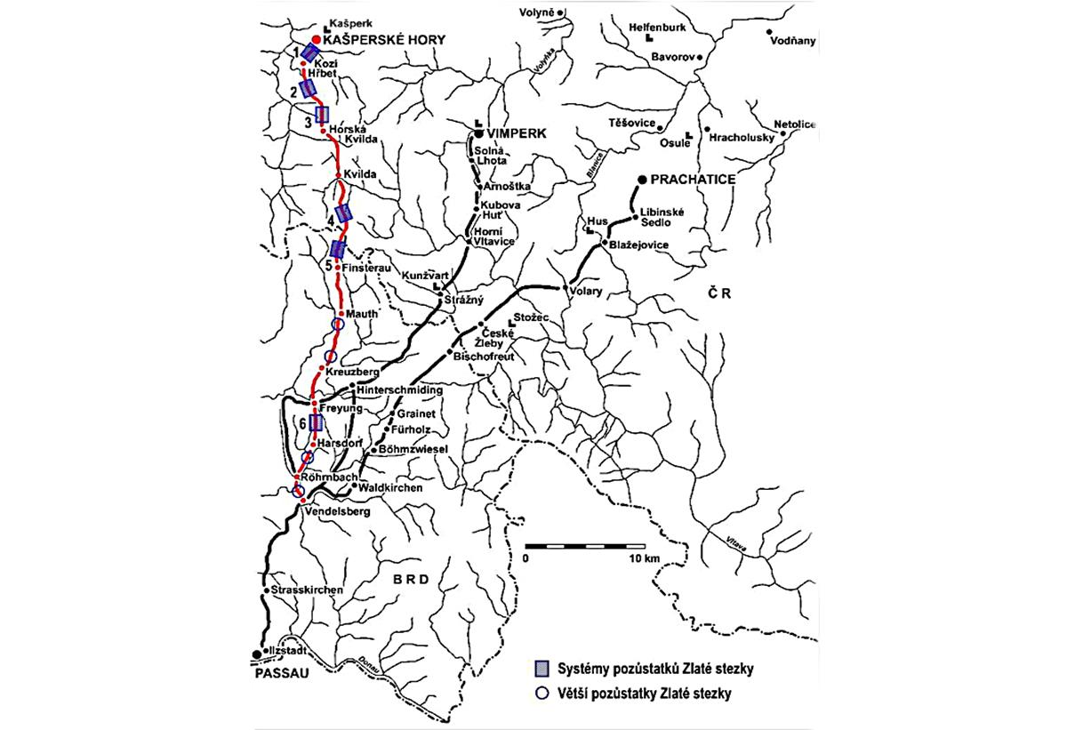 They both began in Passau. The Golden Trail, or rather its third branch, led towards Freyung, Mauth, Bučina, Kvilda, H. Kvilda do K. Hory. Its competitor, the Golden Road, also began in Passau, but led towards the border across the Bavarian duchy, that is Tittling, Grafenau, border crossing Modrý sloup, Březník, Filipova Huť and Horská Kvilda, where it joined the Golden Trail.