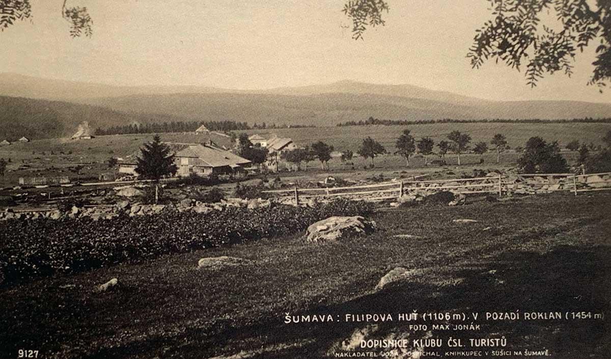 Filipova Huť got its name after the owner of the Prášily estate count Filip Kinský. It was one of the subject villages to the Prášily estate. It is situated on a wide plain in the height of 1903 meters above sea level, lined with clearly visible belts of Šumava and Bavarian forest with two dominant peaks of Roklan. Filipova Huť is our highest situated settlement. In 1785, a glassworks which made hollow glass was established and a village grew around it. After the glassworks closed at the end of the 18th century, loggers settled here. After the completion of the Vchynice-tetov channel in 1800, 17 houses for the families of lumberjacks were built in the village.