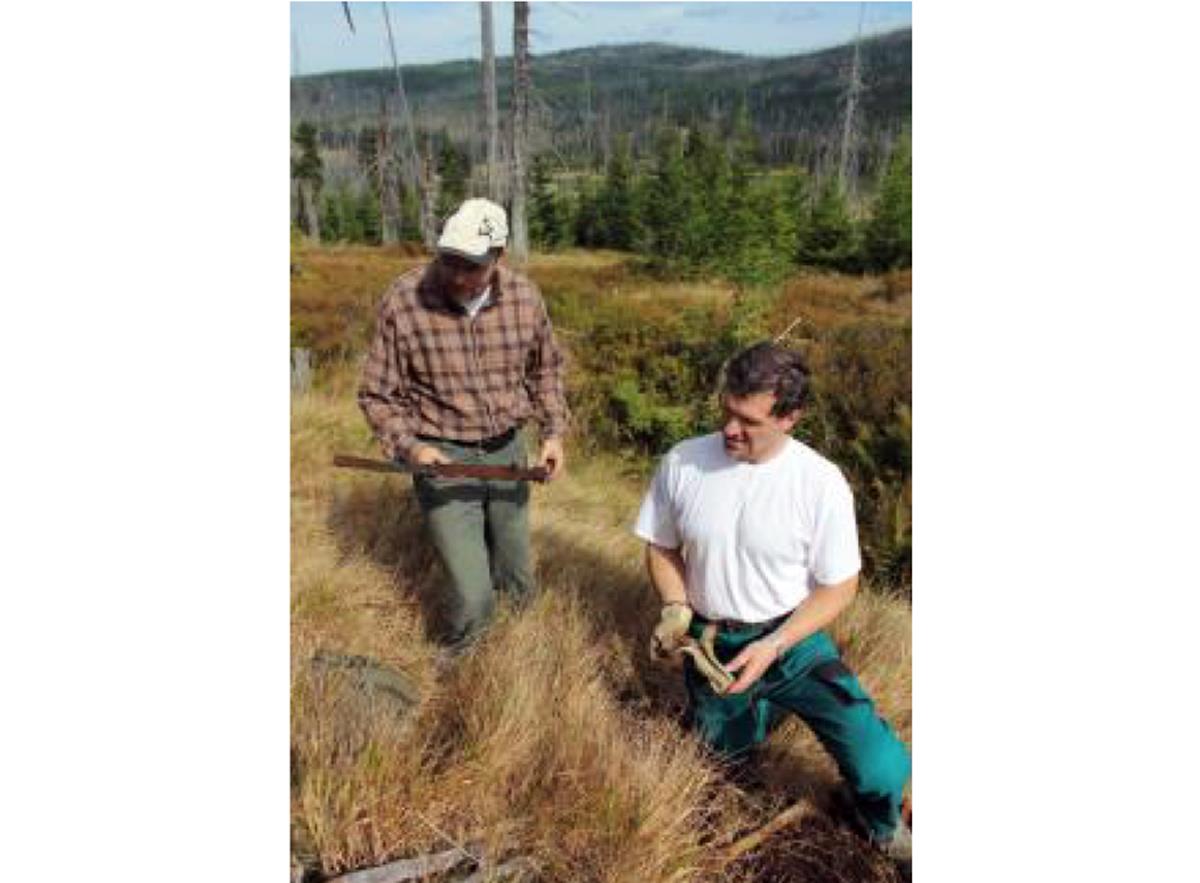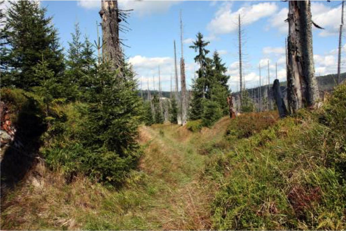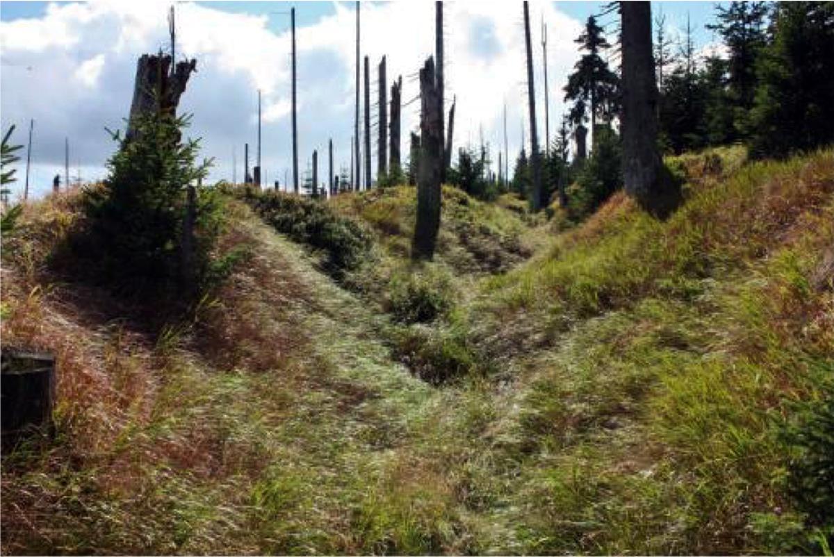 From the gamekeeper’s lodge in Březník, the Golden Road descended in a southeastern direction towards the Březník stream valley. After crossing the stream it reached today’s road, which leads west from the resting place by the end of the Modrava road and towards Studená (Cold) mountain, then to the marshes of the National Park towards Medvědí (Bear) mountain (1224 m). After crossing the road towards Studená mountain, the Golden Road connects to the remains above the gamekeeper’s lodge and begins to climb in a south-eastern direction towards the state border with Bavaria .