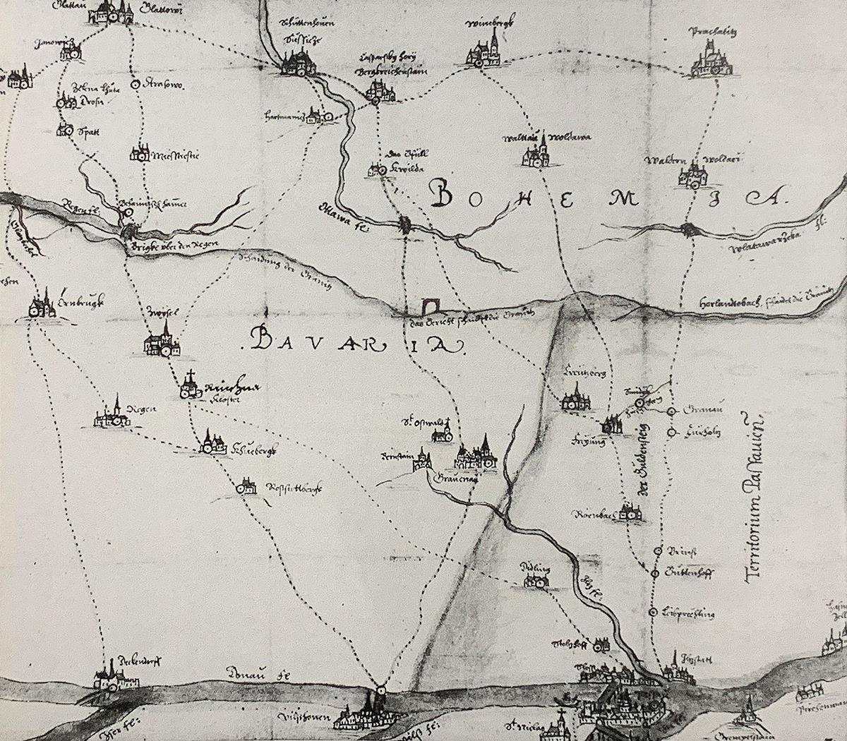 The most famous historical route is the Golden Trail. Its oldest route is its Prachatice branch, sometimes called the Lower branch. It has existed since the early 10th century, even though its name “Golden” comes from the 16th. It led from Passau through Salzweg, Waldkirchen, Grainet, Bischofsreut, it crossed the border by Marchhäuser and continued across České Žleby, Volary, Cudrovice, around the Hus castle, through Albrechtovice and to Prachatice. It is questionable which ones of the named places already existed, or if there was yet any kind of settlement. The first mentions of the villages date from later on and they most likely grew up alongside the already existing trail. In Prachatice the trail split and continued in a couple of directions, the most important one towards Netolice, where it connected with the trail from Vodňany and continued through Písek to Prague.